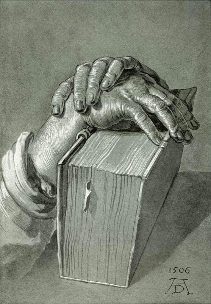 Albrecht Dürer (1471 – 1528), Étude de la main avec la Bible, 15068, 281 x 127 cm, Münich, (Allemagne)