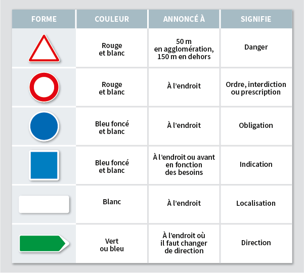 Chaque panneau a une forme, une couleur et un contenu (symboles, pictogrammes, textes). Ces aspects se combinent pour donner au panneau une signification unique.