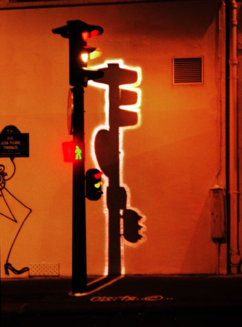 L’idée lui est venue en voyant l’ombre de son scooter sur le bitume… Il décide d’en tracer le pourtour à la bombe. Avec un trait de peinture blanche (utilisée pour tracer la route), il souligne les contours d’un feu tricolore, d’un panneau de signalisation, d’un banc public, il trace même des silhouettes humaines sur le sol… de quoi interpeller les citadins.
