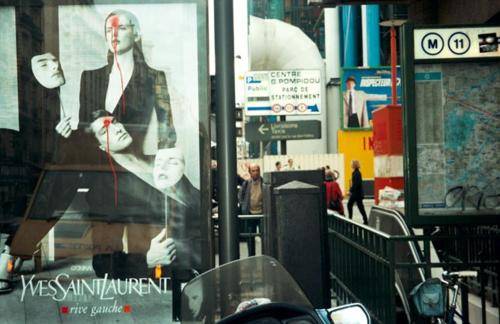 Il commence à faire du détournement visuel d’affiches publicitaires en bombant un point rouge au milieu du front des personnages de la publicité. Il shoote le cerveau des tops modèles à l’encre rouge dégoulinante et joue ainsi avec les codes du crime. L’effet est macabre au possible et les publicitaires, furieux, vont jusqu’à payer des agents de sécurité pour veiller sur leurs affiches. Du jamais vu ! C’est d’ailleurs ce projet qui lui a causé le plus de problèmes avec les autorités françaises.