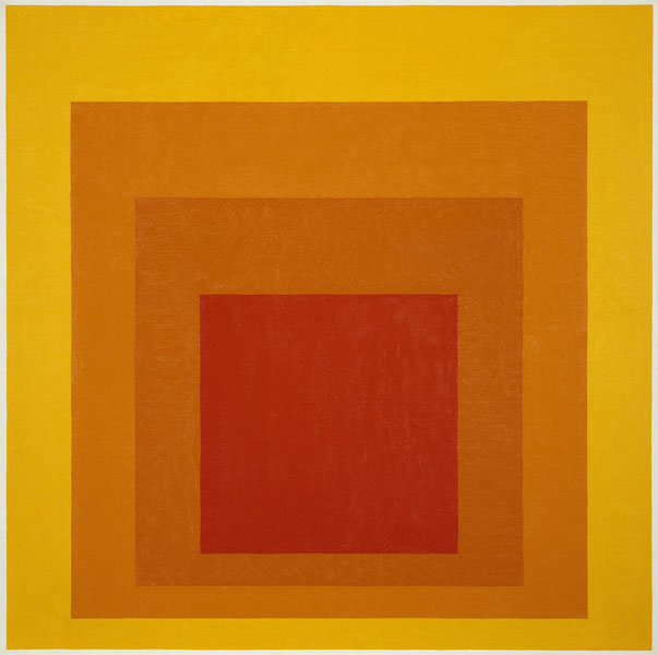 Cette série, amorcée en 1950, représente l’aboutissement de la recherche d’Albers sur l’interaction des couleurs. Grâce à un format simple et répétitif de carrés imbriqués, il a créé un large éventail de compositions démontrant comment les couleurs peuvent mutuellement s’influencer et comment notre perception chromatique peut varier en fonction du contexte.