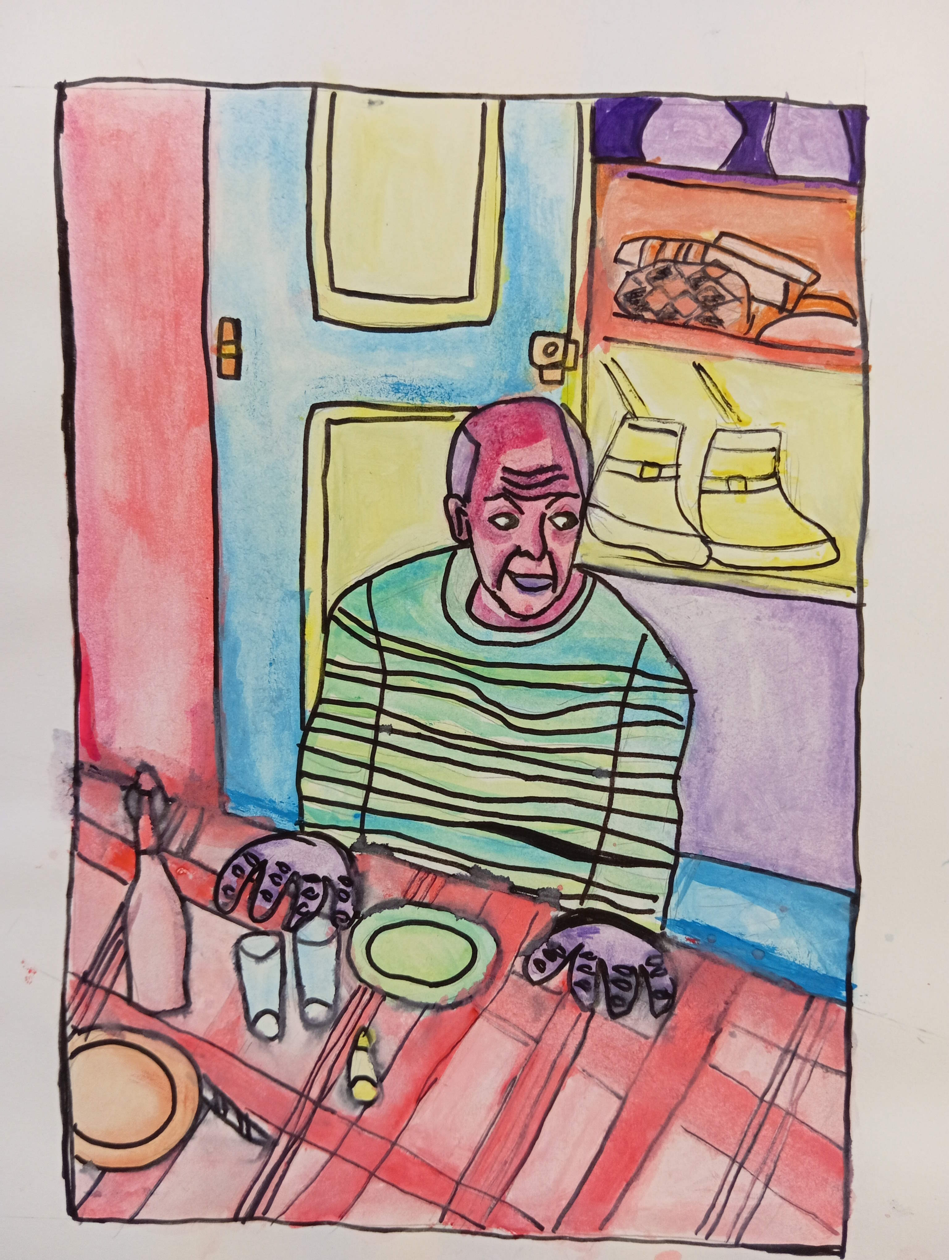 Après avoir dessiné la photographie de Robert Doisneau, Les pains de Picasso, sur une feuille de papier. Je mets en couleur mon dessin à l’aide de mon cubICASSO.
