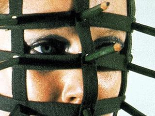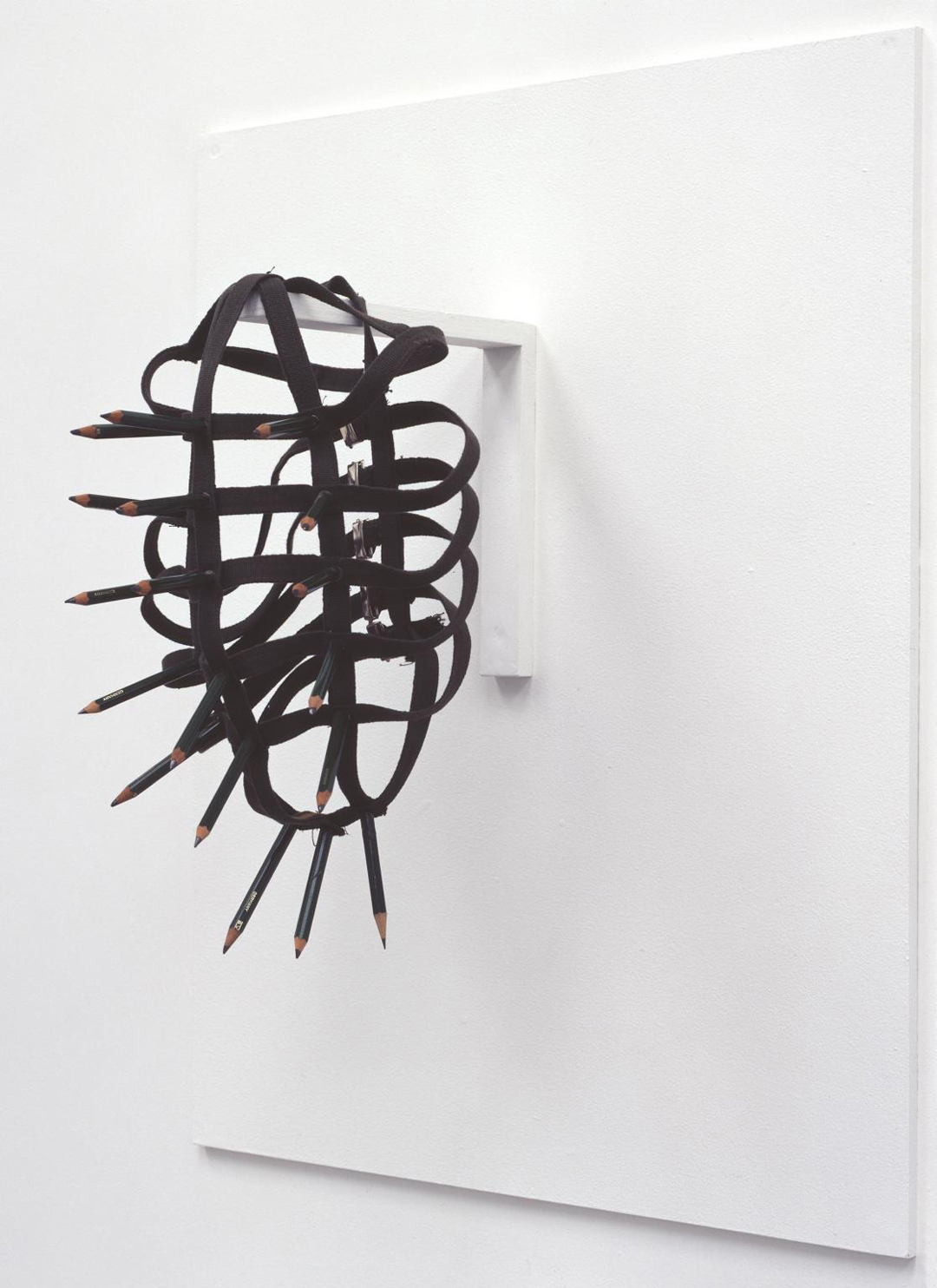 Pencil Mask (masque-crayons) est une œuvre emblématique de Rebecca Horn réalisée en 1973. Dans cette performance, l’artiste porte un masque constitué de lanières de cuir auxquelles sont fixés des crayons courts de couleur verte. Elle se tient face à un mur blanc et commence à tirer et à faire glisser les crayons sur la surface, produisant un son caractéristique à chaque mouvement. Pendant la performance, Rebecca Horn cligne des yeux de façon répétée, ce qui fait que les crayons « rebondissent » ou « sautent » lorsqu’elle bouge la tête.