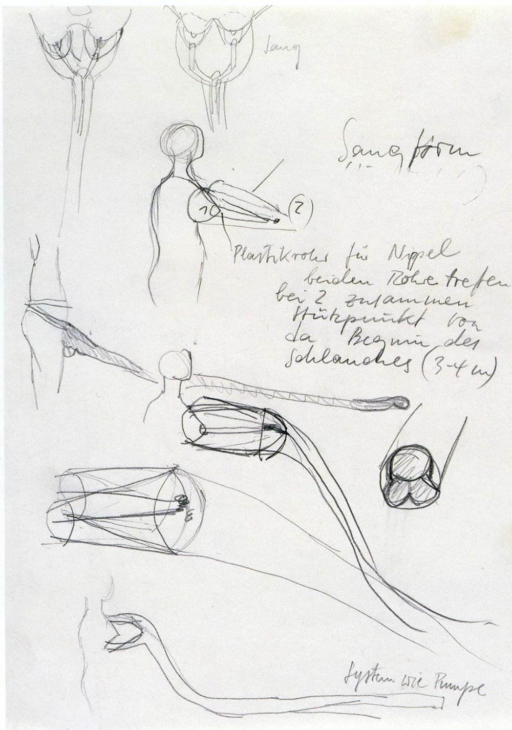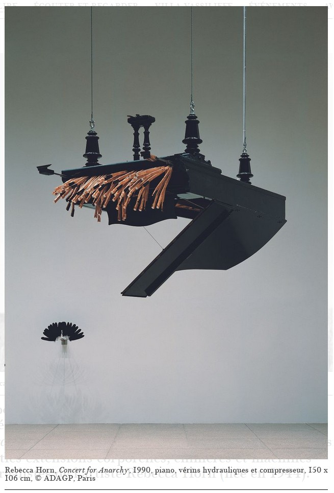 Après avoir réalisé un ensemble de performances (Toucher les murs des deux mains en même temps, 1972-1975) et d’objets en relation au corps (masque-crayons, 1972), Rebecca Horn construit des machines animées. Son travail mêle allusions littéraires (à Joyce, Beckett ou Willy) et références sexuelles métaphysiques ou cinématographiques, autobiographiques. Elle installe, suspendues à des chaînes, accrochées à des tiges de métal, toutes sortes d’objets.