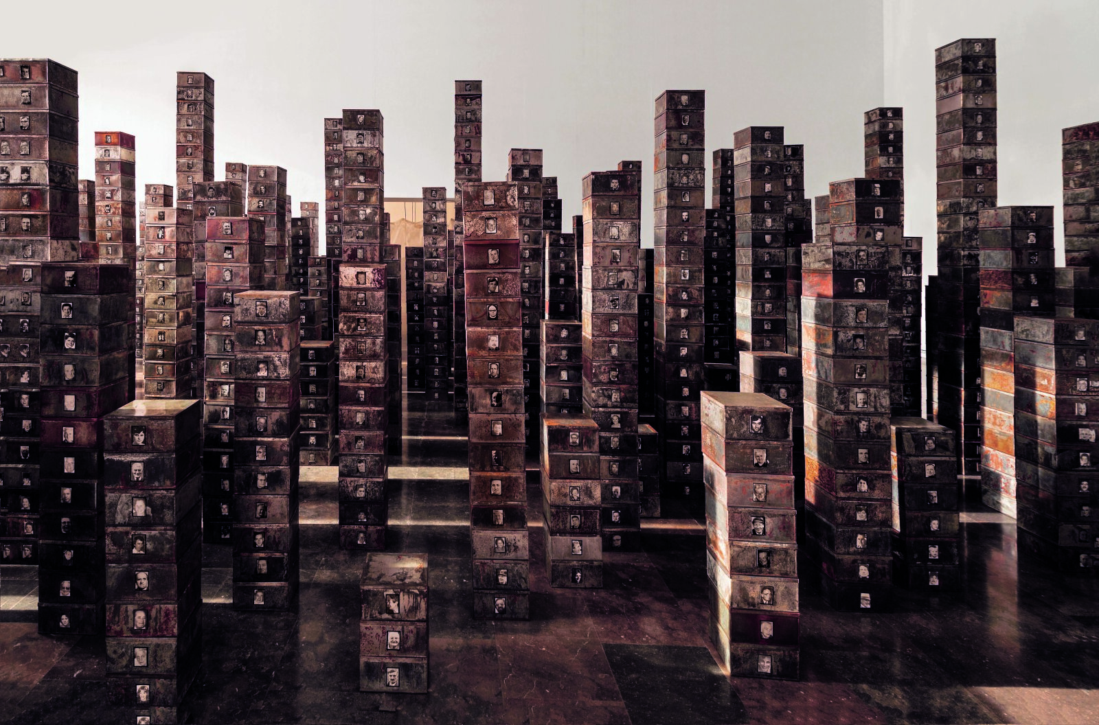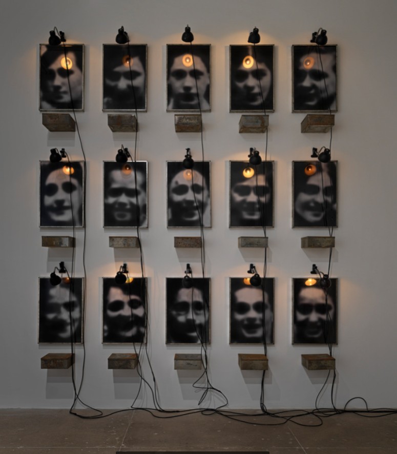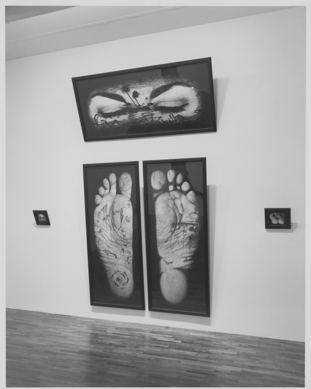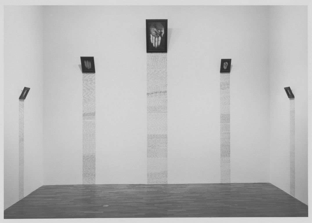 Avec cette œuvre, composée de dizaines de photographies de détails de corps, Annette Messager met en scène une identité fragmentée, qui se décompose et se recompose comme les éclats d’un kaléidoscope. Bien qu’elle fasse référence au vocabulaire du minimalisme, par la forme simple dans laquelle s’inscrit cet ensemble comme par le choix du noir et blanc, l’image qui en résulte, comme suspendue par une multitude de longues ficelles apparentes, rappelle plutôt les ex-voto. L’artiste a souvent puisé son inspiration dans les pratiques de dévotion populaire qui ornent les églises de compositions baroques et hybrides. La série « Mes Vœux », qu’elle développe à partir de la fin des années 1980, incorpore cette référence à une réflexion plus vaste sur le corps, la sexualité, l’identité. En mélangeant des détails, souvent récurrents, prélevés sur des corps des deux sexes et de tous âges, Annette Messager questionne les fondements anthropologiques de la représentation, à la lumière des interrogations sur l’homme produites par l’histoire contemporaine comme par la psychanalyse. Sous le dehors objectif des prises de vues photographiques, c’est à un dispositif fictionnel qu’elle confronte le spectateur, une histoire de corps nourrie des observations comme des obsessions de l’artiste. Le regardeur se trouve happé par ce reflet démultiplié de lui-même, qu’accentue la grande dimension d’une installation dont la présence physique, quasi sculpturale, n’est perceptible que dans le corps à corps de cette confrontation directe.