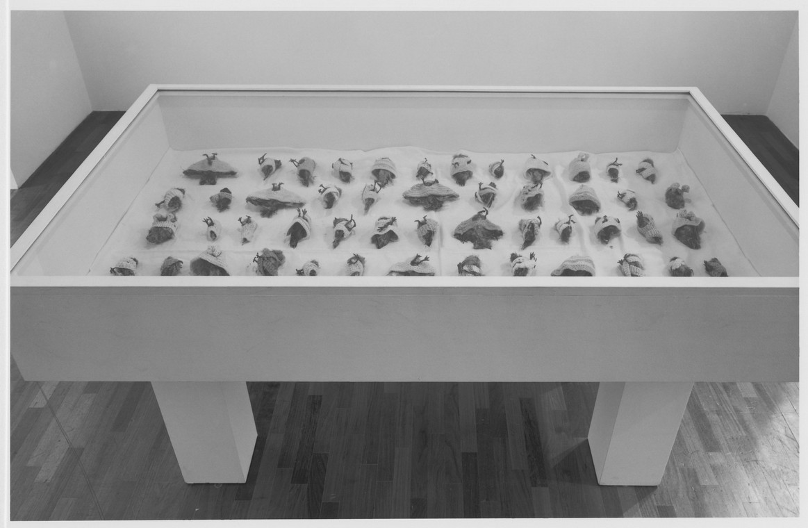 Elle développe une fiction plus intime avec Les Pensionnaires (1971-1972), des oiseaux naturalisés et emmaillotés dans des tricots, qu’elle met en scène dans des vitrines. Dans les années 1980, le caractère théâtral de son travail s’affirme, tant par le traitement grotesque des images que par leur installation dans l’espace. Pour Les Variétés (1980-1981), elle compose des formes à partir de fragments photographiques de visages ou de corps, sur lesquels elle peint et qu’elle déploie sur les murs et le plafond. Elle déforme les images et l’échelle dans Les Chimères (1982-1984), de grands photomontages peints inspirés des contes de fées. À partir de 1988, l’artiste achète, dans des brocantes, des peluches qu’elle utilise dans ses œuvres pour symboliser de façon comique notre part animale. Mes petites effigies (1988) est une installation murale qui mêle peluches, photographies de fragments de corps et mots (attente, désir, soupçon…) inscrits sur le mur.