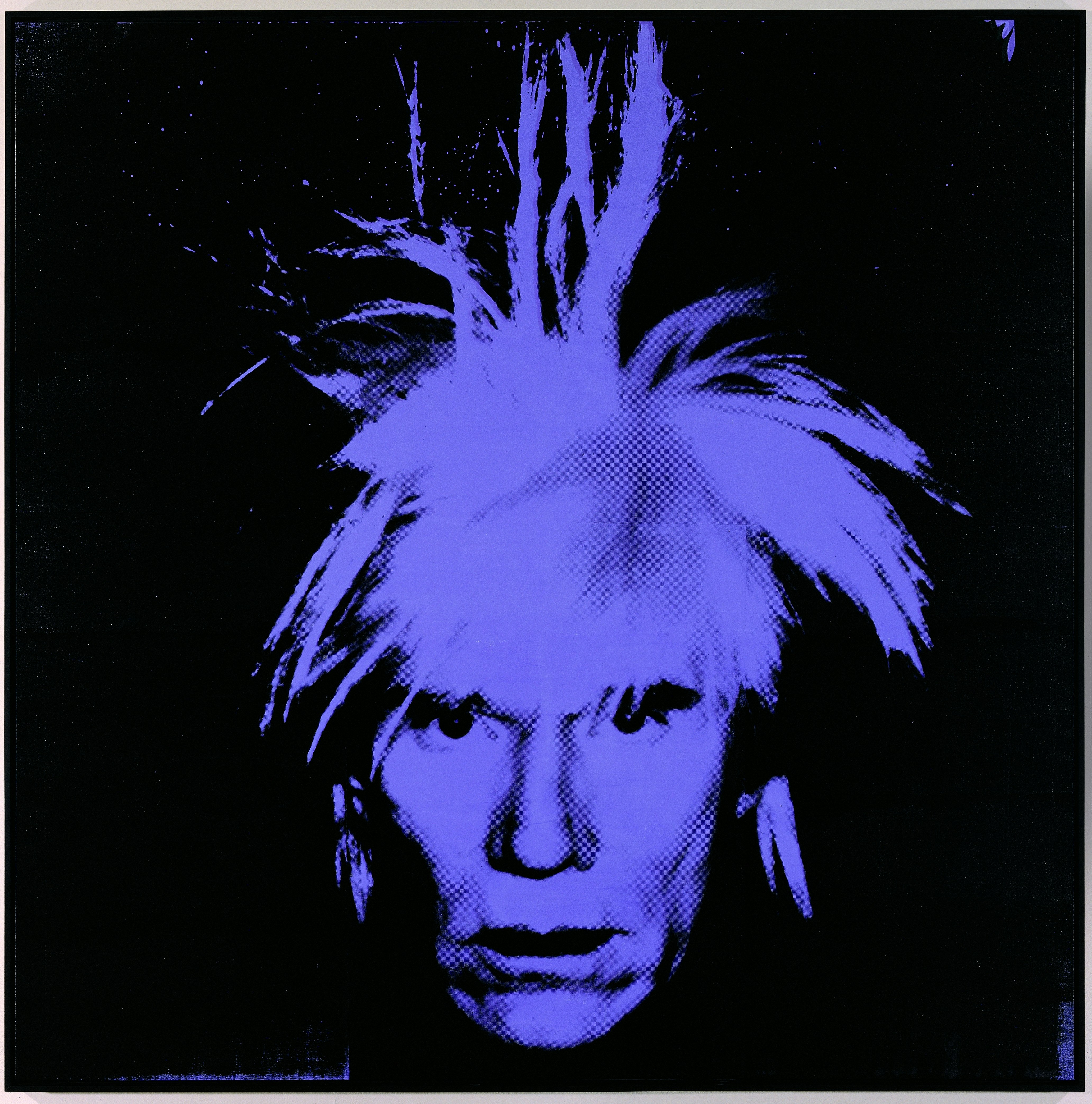 L’artiste effectue plusieurs versions à partir de différents Polaroids, varie les cadrages, les formats et les couleurs. Il choisit un éventail de teintes profondes et agressives (jaune, rouge, violet, vert, bleu) qu’il contraste avec un fond monochrome noir. À la différence de ses portraits en buste, Warhol ne laisse apparaître ni le cou ni les épaules, seul son visage surgit en gros plan et occupe toute la toile comme c’est le cas ici. Le visage frontal, désincarné, séparé de son corps, semble flotter tel un masque mortuaire. Warhol porte une perruque argentée de cheveux ébouriffés, surnommée « fright wig » (souvent traduite en français par « perruque panique »). La chevelure surnaturelle lui donne une allure spectrale. Le regard absent, fixé vers l’objectif, et l’expression à la fois méditative et intense de l’artiste vieillissant dégagent un mélange de désespoir et d’angoisse. L’impact du violet accentue sa dimension tragique, et le format