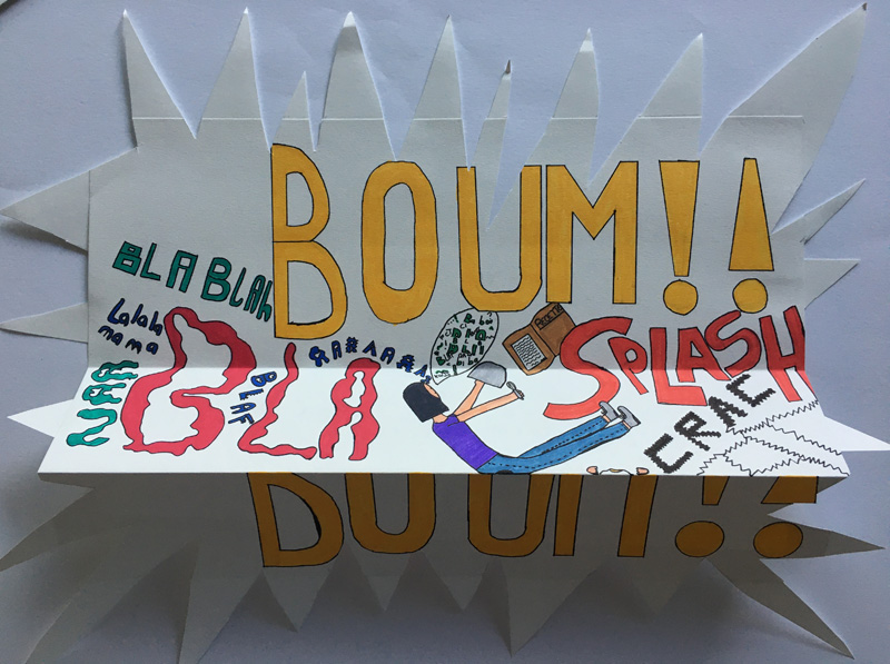 - ONOMATOPÉE : Mot créé pour imiter des sons produits par des êtres animés ou des objets. Les onomatopées, très utilisées en B.D., relèvent d’abord de l’écrit et non du dessin : ce sont les PAF, BOUM et autres SCHTONG qui parsèment les planches, en particulier dans les scènes d’action. Elles ont pour rôle de restituer un bruit. Chaque auteur les interprètent à sa manière. Le bruit d’un coup de feu, par exemple, sera traduit aussi bien par un « pan » ou un « bang ».